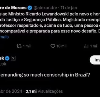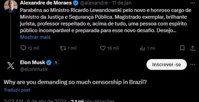 Musk entrou na disputa compartilhando publicações do jornalista e alegando, sem apresentar evidências concretas, que Moraes "impôs multas substanciais, ameaçou prender funcionários e restringiu o acesso do X no Brasil". A discussão, que agora envolve políticos, líderes e ativistas das mais diversas orientações políticas, ganhou destaque com a figura abaixo (questiona Moraes em uma postagem anterior, na qual o ministro parabenizou #RicardoLewandowski por seu novo cargo como Ministro da Justiça e Segurança Pública).