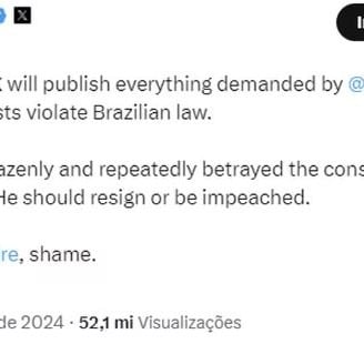Publicação de nota pelo "X" afirmando ter sido forçado por decisões judiciais a bloquear contas populares no Brasil, alegando desrespeito ao Marco Civil da Internet e à Constituição Federal;
