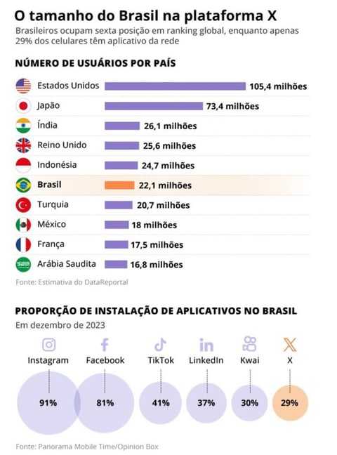 Apesar de não liderar em preferência entre as redes sociais no país, a Rede tem um papel significativo no debate público e no cenário político. A empresa passou por reformulações sob o comando de Musk, enfrentando questionamentos também em nível internacional e sofrendo impacto financeiro em seu valor de mercado, uma vez que em dezembro, o X afirmou que a empresa valia cerca de US$ 19 bilhões — valor 55% menor na comparação com os US$ 44 bilhões que Musk pagou pela empresa um ano antes, segundo o jornal “The New York Times”.