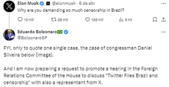 Ao deparar-se com a publicação, Musk foi incisivo: "por que vocês exigem tanta censura no Brasil?". Essa postura do empresário, comumente associada a uma defesa intransigente da liberdade de expressão, tem suscitado debates acerca de sua possível inclinação para setores políticos de tendência mais conservadora. Embora a defesa da liberdade de expressão seja tradicionalmente vista como um valor essencial para a democracia, críticos argumentam que essa posição pode contribuir para a amplificação de discursos prejudiciais, incluindo a disseminação de conteúdo odioso, desinformação e ameaças à estabilidade democrática.