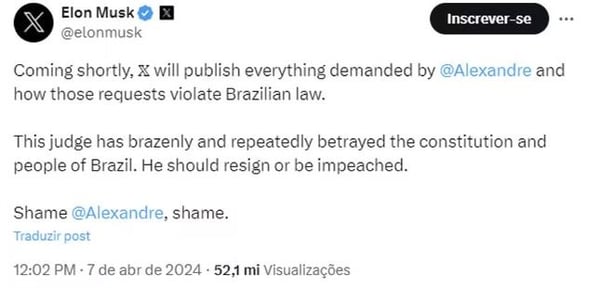 Em meio às recentes declarações, Elon Musk não hesitou em chamar Alexandre de Moraes de 'ditador brutal' e anunciar sua intenção de retirar funcionários do X do Brasil em resposta às determinações judiciais. Longe de ter fim, o embate entre o CEO do X e o Ministro do STF continua a ser acompanhado de perto. Essa escalada de tensão não apenas suscita debates acalorados sobre liberdade de expressão e regulação da internet, mas também destaca a crescente influência das grandes empresas de tecnologia no cenário político e jurídico. À medida que os acontecimentos se desdobram, é evidente que as implicações desse conflito vão além das fronteiras nacionais, ecoando questões globais sobre poder, responsabilidade e democracia digital.